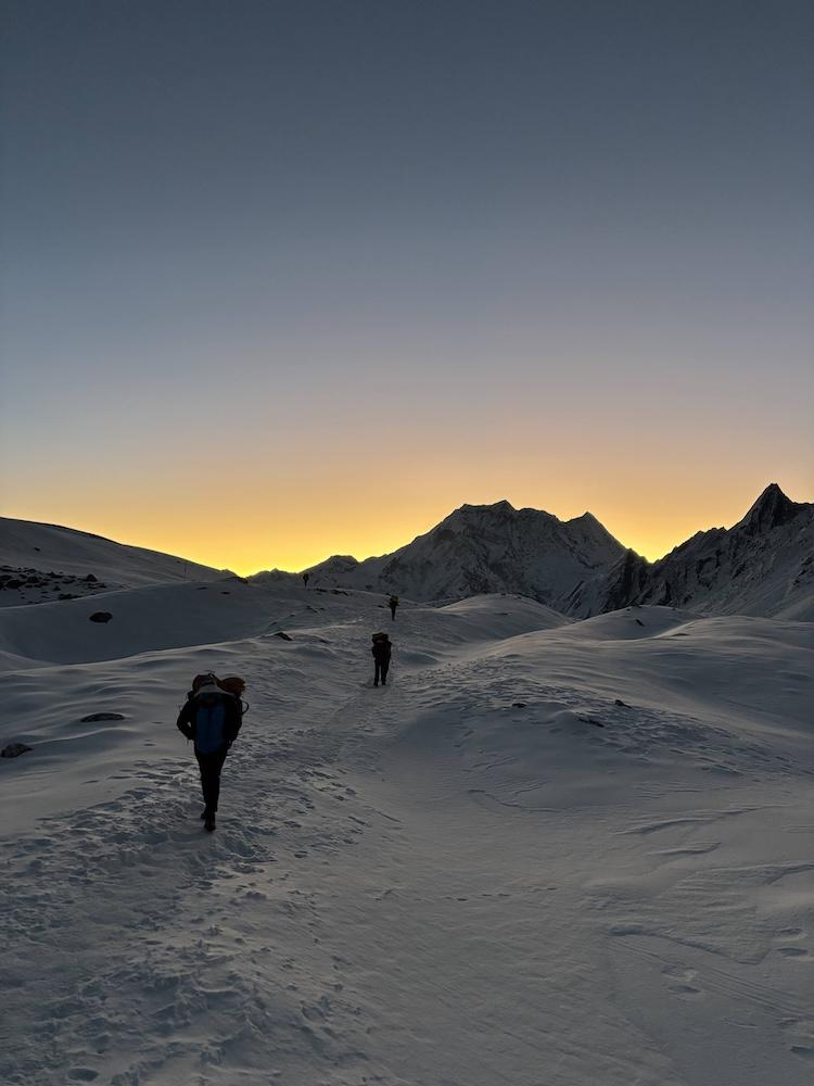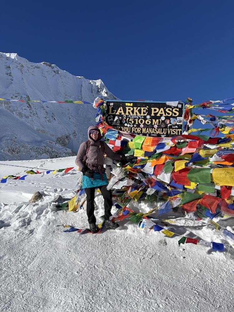 Dann ist der große Tag gekommen: Die Wecker klingeln früh und spätestens um 04.00 Uhr machen sich die meisten Trekker auf den Weg in Richtung Pass. In einer immer wieder unterbrochenen Kette bewegen sich die Stirnlampen der Trekker wie Glühwürmchen den Weg entlang. Es geht langsam voran, das Atmen fällt merklich schwer. Irgendwann hebt sich die Dunkelheit und hinter den schneebedeckten Bergen geht plötzlich die Sonne auf und taucht die ganze Szenerie in ein warmes Licht. Und dann sieht man endlich in der Ferne die Passhöhe - geschafft: der Larke La Pass auf 5.106 m Höhe ist erreicht. Oben heißt es dann: freuen, staunen und den einmaligen Moment genießen. Natürlich muss das obligatorische Foto gemacht werden und im Idealfall hat man eine Reihe Gebetsfahnen mitgebracht, die man bei den tausenden anderen befestigt, um seine Gebete und Wünsche vom Wind möglichst weit tragen zu lassen.