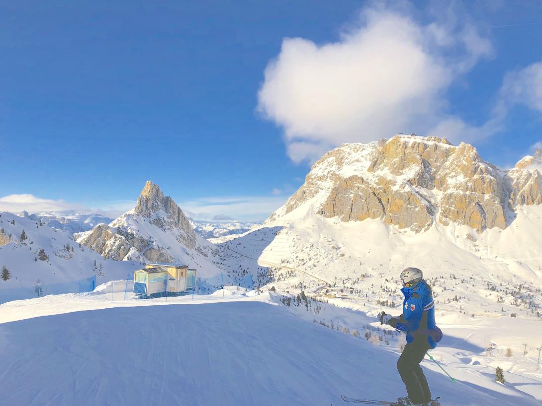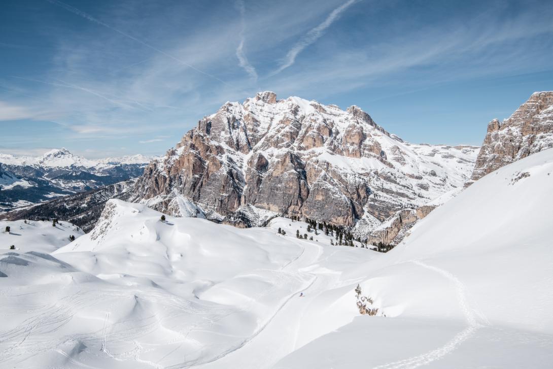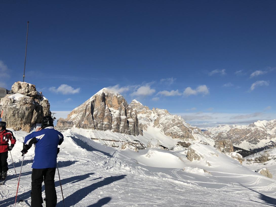 Unser nächstes Ziel ist Alleghe zu Füßen des Civetta-Skigebiets. Die leeren breiten Pisten und das grandiose Panorama mit den breiten Felswänden der Civetta lassen die Busfahrt schnell vergessen. Wir sind nun in der Provinz Belluno und der Unterschied zwischen Südtirol und Veneto artikuliert sich nicht nur in der schlichteren, weit weniger rustikalen Architektur sondern auch in den deutlich älteren Liftanlagen. Aber das ist bald egal, denn das Panorama mit dem 3168 Meter hohen Monte Pelmo fasziniert einfach, dass man sich schwer tut, die Tour fortzusetzen. Aber es warten ja noch andere alpine Celebrities. Eine gemütliche Abfahrt hinunter nach Pescul und dann mit dem Skibus Richtung Norden zum Passo Giau. Rennradler verehren die Strecke, die immer wieder ein Highlight beim Giro d`Italia ist. Nach der Seilbahnfahrt landen wir bei der berühmten Averau Hütte auf 2413 Metern Höhe. Die Hütte ist bekannt für gute regionale Küche wie zum Beispiel die Tirtlan mit Rotkohl oder Wildschweinhaxen mit Polenta und auch entsprechend frequentiert. Rechts baut sich das Averau Felsmassiv auf. Vor uns die Skulpturenlandschaft der Cinque Torri. Wenn dann noch die Nachmittagssonne die Szenerie in ein warmes, kraftvolles Licht taucht inklusive Enrosadira, der bekannten Nachmittagsröte der westseitigen Felswände, dann wird es fast unerträglich romantisch. Und so geht es auch weiter bei der Abfahrt Richtung Falzarego Pass. Eine Landschaft wie ein gigantisches Kunstwerk. Vor uns der Lagazuoi, rechts baut sich die Tofana auf, Hausberg von Cortina d’Ampezzo.