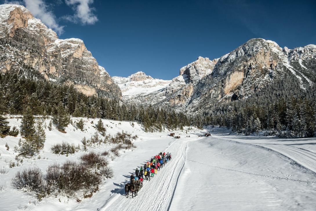 Danach folgt ein flaches Stück Richtung Alta Badia bis zu der Stelle, wo ein Bauer mit seinen Haflingern wartet und die Skifahrer und Snowboarder am Seil auf gut 1,5 Kilometern bis zur Straße bei Armentarola zieht. Der wahrscheinlich umweltfreundlichste Skilift in den Dolomiten. Dort geht es dann auf der anderen Straßenseite weiter hinauf nach Pralongia und auf einer schönen Piste hinunter zurück zum Campolongo. Insgesamt eine echte Traumtour, bei der man überlegen sollte, ob man sie nicht besser auf zwei Tage aufteilt und unterwegs übernachtet.