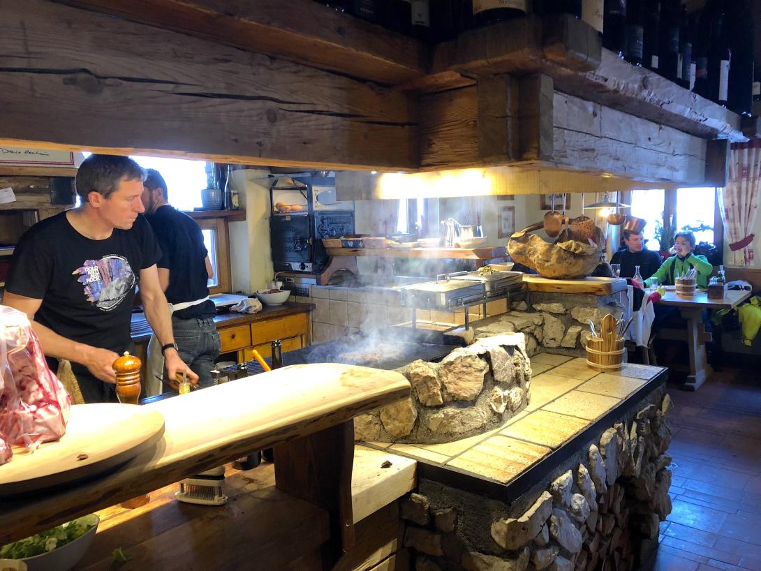 Unten am Falzarego wechseln wir auf die andere Straßenseite und nehmen die Seilbahn auf den Lagazuoi. Oben sollte man sich Zeit nehmen für einen Abstecher links zum Rifugio auf dem 2778 Meter hohen Kleinen Lagazuoi. Dort oben auf der Terrasse wartet das wahrscheinlich spektakulärste Dolomitenpanorama. Wer sich nicht satt sehen kann, es gibt hier oben auch Übernachtungsmöglichkeiten. Im Sommer zieht es viele Wanderer zu den Spuren der Geschichte an diesem Berg, der vom Ersten Weltkrieg her durchlöchert ist mit Stollen und alten Stellungen. Auf der Rückseite des Lagazuoi kommt eine knapp neun Kilometer lange Piste, eine der längsten und schönsten Abfahrten in den Dolomiten, die gerade wegen ihrer abseitigen Lage nicht überlaufen ist. Auf den ersten Hängen blicken wir hinüber zu den im Sonnenlicht leuchtenden Felswänden des Conturines-Massivs, wo sich auf gut 2800 Metern Höhe eine legendäre Höhle befindet, in der vor 35 Jahren Überreste eines prähistorischen Höhlenbärs gefunden wurden. Die Sonne ist längst hinter dem Lagazuoi verschwunden, und die Abfahrt schlängelt sich im Schatten durch das enge Tal. Unterwegs öffnet sich rechts der Blick hinein Richtung Fanesalm, leuchten ganz links die Schneehänge unter dem Grödner Joch direkt neben dem Sella-Massiv. Ein ungewöhnliches Arrangement von Dolomiten-Berühmtheiten begleitet die letzten Schwünge und ein paar flache Meter bis zur Scotoni-Hütte. Eine Institution seit vielen Jahren ist diese urgemütliche rustikale Hütte auf knapp 2000 Metern Höhe. Drinnen brutzelt es am Grill, dafür ist die Scotoni bekannt, sitzt man umgeben von schweren Holzbalken. Ob man nun eine der Grillspezialitäten goutieren will oder nur einen Espresso, ein Stopp ist hier fast Pflicht.
