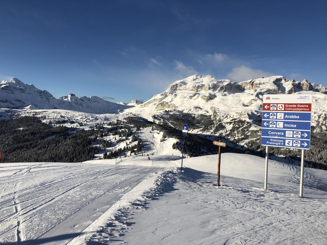 Der Campolongo Pass auf 1875 Metern oberhalb von Corvara ist im Vergleich zu seinen Nachbarn Pordoi und Sella recht unscheinbar. Aber er ist ein idealer Startort für unsere Runde. Es gibt Parkplätze, eine schöne Aussicht und eine herrliche lange Abfahrt hinunter nach Arabba. Wir haben uns heute die Gebirgsjägerrunde vorgenommen, die über Arabba an der Marmolada entlang bis Malga Ciapela verläuft. Nach einem Intermezzo mit dem Skibus queren wir die Civetta, diesen monumentalen Skiberg, der zusammen mit dem Monte Pelmo wie eine gigantische Statue in der Landschaft steht. Danach folgen mit Cinque Torri und Lagazuoi weitere legendäre Dolomiten Schönheiten, bis es zurück nach Alta Badia und Campolongo geht. Ein Bilderbuchstart auf herrlichen Südhängen mit jeder Menge Sonne und Panorama.