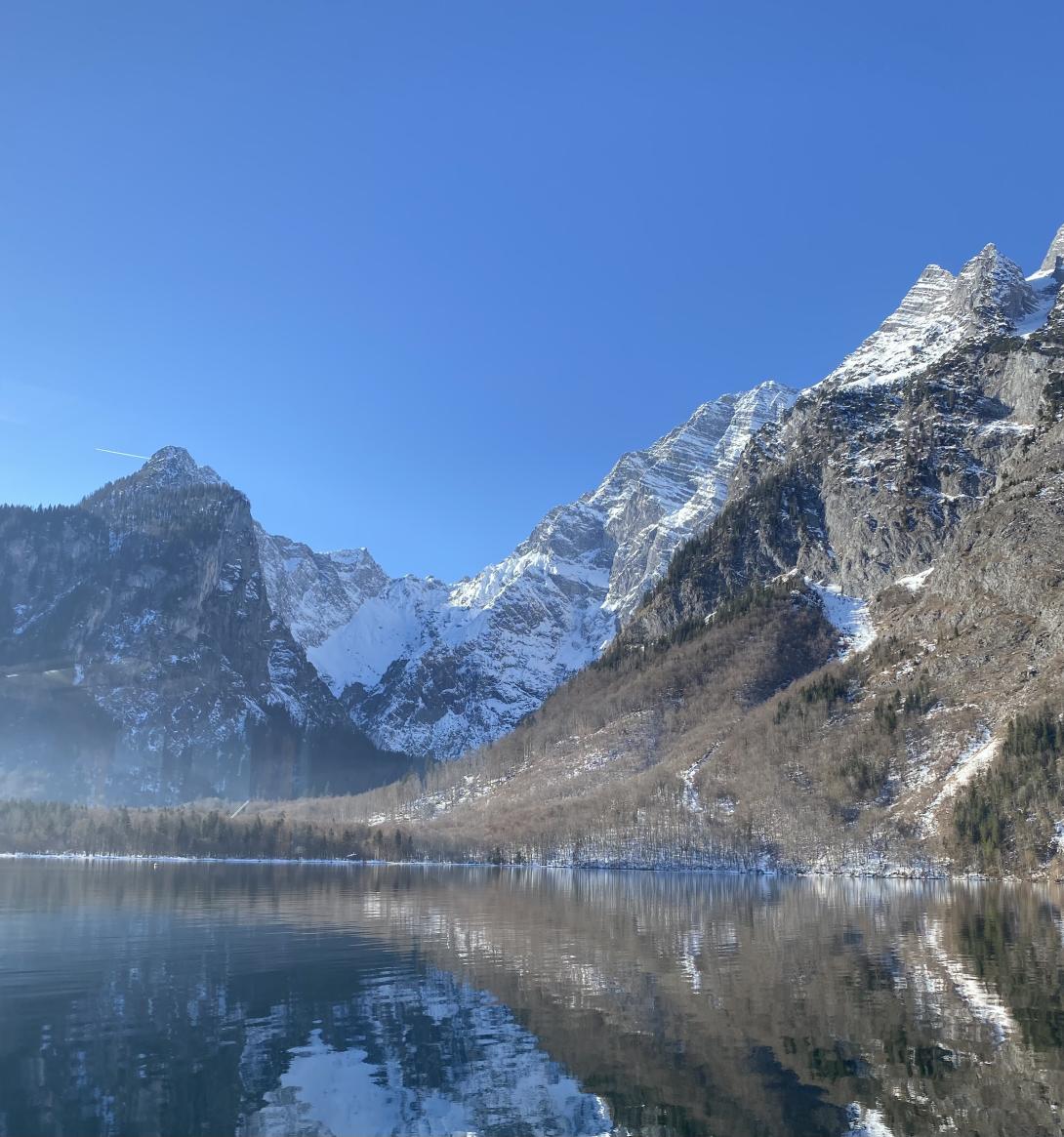 Das Schiff sticht in den Königsee, die Fahrt geht an steilen Felswänden entlang. Ein Mann von der Bayerischen Seefahrt erklärt, dass der Königsee Trinkwasser-Qualität hat und mit zu den saubersten Seen ist Deutschland zählt. Er lacht, wir Anwohner trinken allerdings kein Wasser. Auf der linken Seite ist der Malerwinkel zu sehen, das ist der beste Punkt für Künstler, um den See auf die Leinwand oder Papier zu bannen.