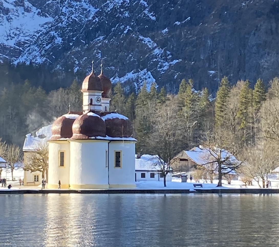 An der weltberühmte Echowand stoppt das Schiff und die Fenster zur Felswand werden geöffnet. Der Unterhalter spielt auf einem Flügelhorn eine Melodie und tatsächlich das Echo kommt von der Wand zurück. Der Flügelhornbläser wird mit einem Trinkgeld belohnt. In St. Bartholomä, zu Füssen des mächtigen Watzmanns, angekommen geht es weil die Sonne scheint gleich in den Biergarten. Einen Fisch aus dem Königsee sollte man sich nicht entgehen lassen. Das Jagdschloss ist heute Ausflugsgaststätte, früher kamen die Wittelsbacher hierher um zu jagen. Bevor es mit dem Schiff wieder zurück geht, geht es noch in die barockisierte Wallfahrtskirche. Die Vorgängerkirche wurde schon 1134 erbaut.