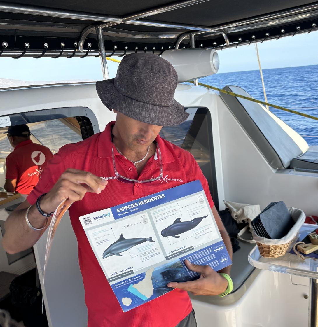 Mein Highlight rückt näher: Am Hafen von Puerto Colón starten wir am späten Nachmittag unsere Wal- und Delfinbeobachtung auf einem exklusiven Katamaran der Firma White Tenerife. Am verbreitetsten sind hier die sogenannten Grindwale – auch Pilotwale genannt. Sie können eine Länge von bis zu sechs Metern erreichen und sind eine Art Delfine.