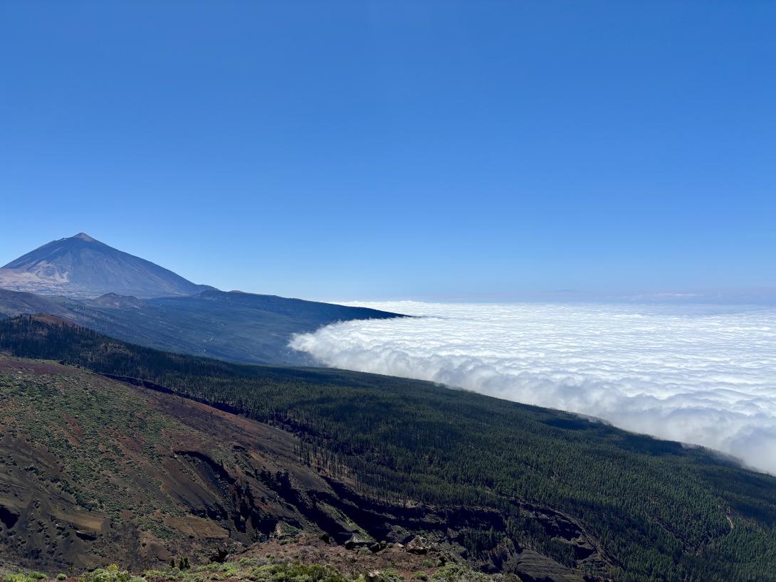 Doch auch unsere Tour durch das Gebiet auf rund 2.000 Metern ist bereits ein einzigartiges Erlebnis. Der aus den Wolken ragende Teide im Hintergrund unseres ersten Stopps an einem Aussichtspunkt ist absolut beeindruckend.