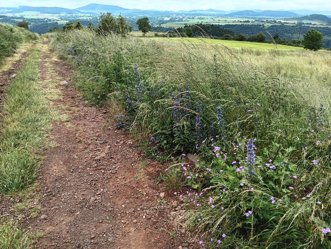 Le Puy liegt im Velay, einer aus Vulkanen entstandenen Landschaft. Ein früherer Krater reiht sich an den nächsten, eine grüne Hügelkette an die andere. Der Begriff „lieblich“ passt selten so gut wie hier. Anfangs begleiten unzählige Steinkreuze den Weg – frühere Anker in einer gottverlassen geglaubten und vielleicht gerade deswegen von tiefer Religiösität durchdrungenen Welt. Allgegenwärtig ist hier aber auch die Landflucht. Beispiel Goudet am Oberlauf der Loire. Wo im 19. Jahrhundert noch 600 Menschen lebten, sind es heute nur noch 60. Wer Einsamkeit und Stille sucht, der wird den Stevenson-Weg lieben. Wer nicht, der kann an ihm verzweifeln. Häufig läuft es sich in völliger Einsamkeit auf welligen Hochebenen durch ein nicht enden wollendes Grün. Im Frühsommer umgeben weiße Schafgarben, roter Klatschmohn, gelber Ginster und ein Meer von blauen Zottigen Wicken den Weg wie ein farbiges Band. Oberhalb von tausend Metern gesellt sich der hüfthohe Gelbe Enzian dazu, aus dessen Wurzeln ein gelblicher, bitterer Aperitiv gewonnen wird.