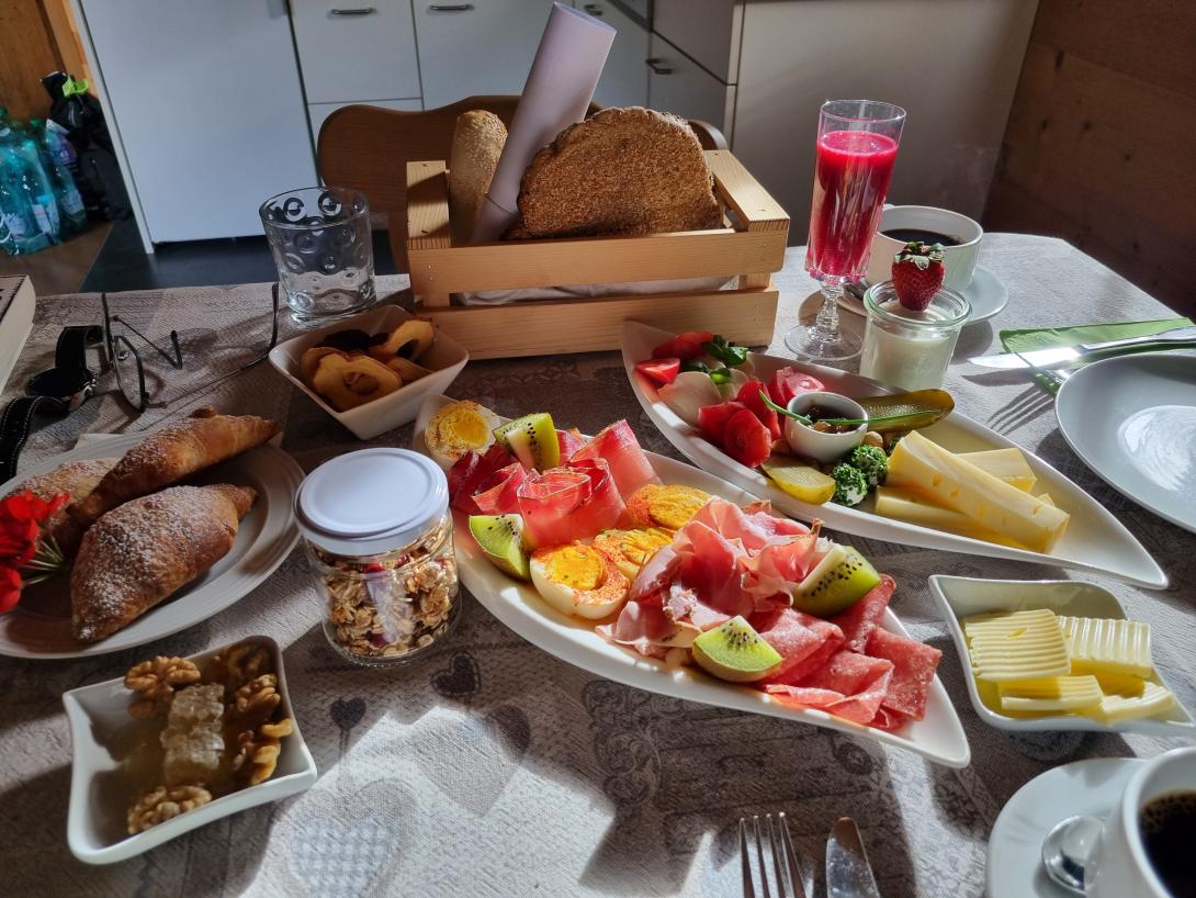 Solch ein umfangreiches und schmackhaftes Frühstück, haben wir bisher selbst in den besten Hotels noch nicht bekommen. Jeden Tag war der Frühstückskorb mit einem Morgengruß anders zusammengestellt mit hofeigenen und regionalen Spezialitäten, wie z.B. Speck, Eier von glücklichen Hühnern – mal gekocht oder als Rührei oder Omelett-, Südtiroler Käse, naturtrüber Apfelsaft, Naturjoghurt, frische Smoothies u.v.m... Und immer war etwas Selbstgebackenes dabei. Vor allen Dingen war das Frühstück so umfangreich, dass es meistens auch für die Nachmittagsjause gereicht hat.