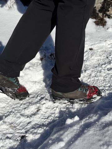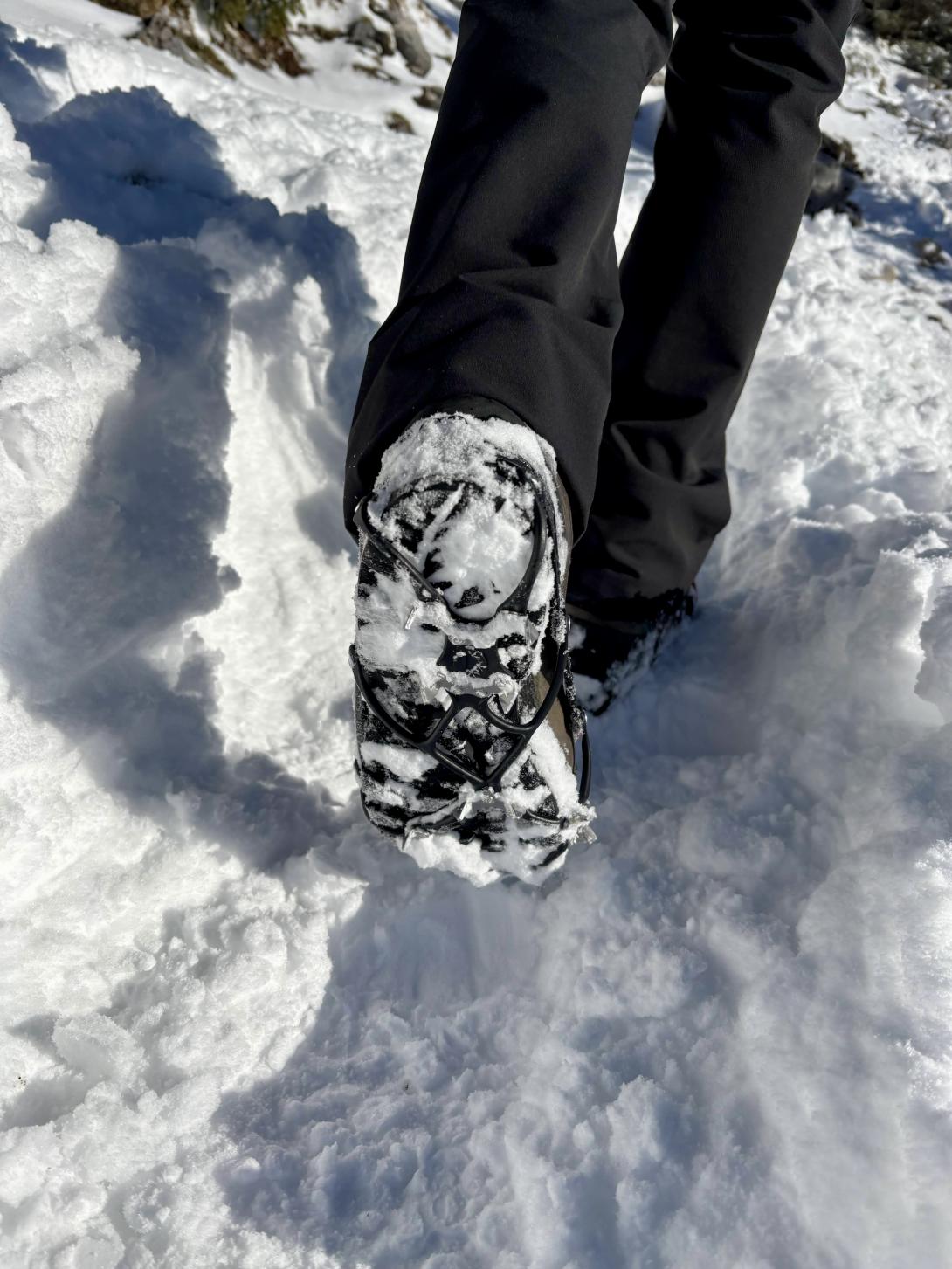 Schon beim Montieren der Grödel an den klobigen Wanderschuhen bin ich von den neuen Microspikes Ghost sehr angetan. Der Korb für die Zehenbox ist aus stabilem Kunststoff und lässt sich ohne viel Gefummel leicht über den Schuh ziehen. Hinten wurde elastisches Material eingesetzt und eine längere Lasche hilft, die Grödel sogar mit Handschuhen ruckzuck über den Schuh zu ziehen. Die Grödel rutschen auch gleich in die richtige Position, so dass es direkt losgehen kann.